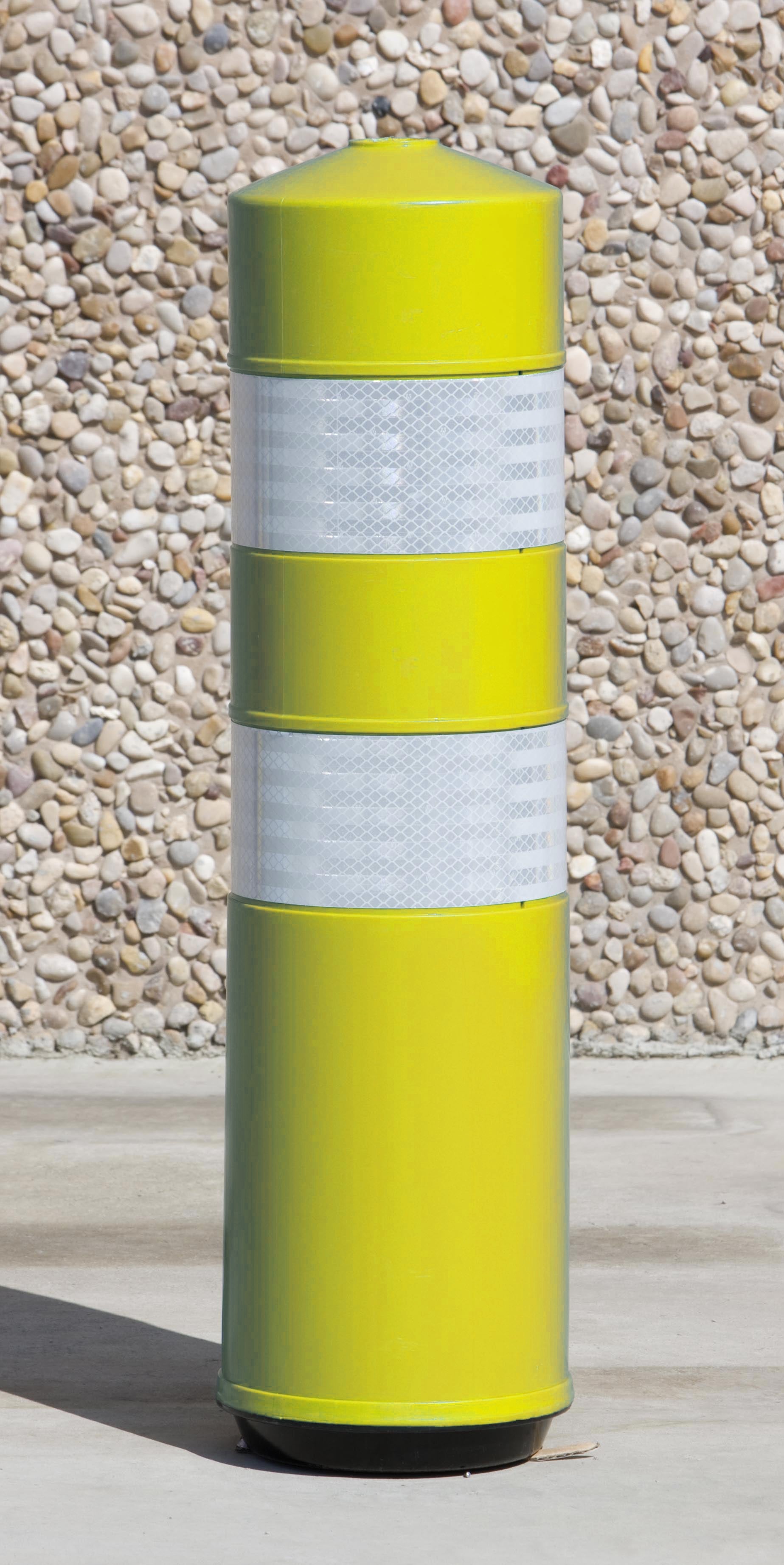 Hito de balizamiento y señalización de Tráfico H75. fabricadas por inyección a alta presión del polímero EVA, de muy alta resistencia al desgarro y al atropello (recupera la forma tras un aplastamiento). Anclaje mediante taco de expansión en Poliamida de Ø18 x 150mm. Las dos bandas reflectantes perimetrales, sus extremos fijados con máquina semiautomática que proporciona un acabado impecable. Retroreflectantes Clase 2.